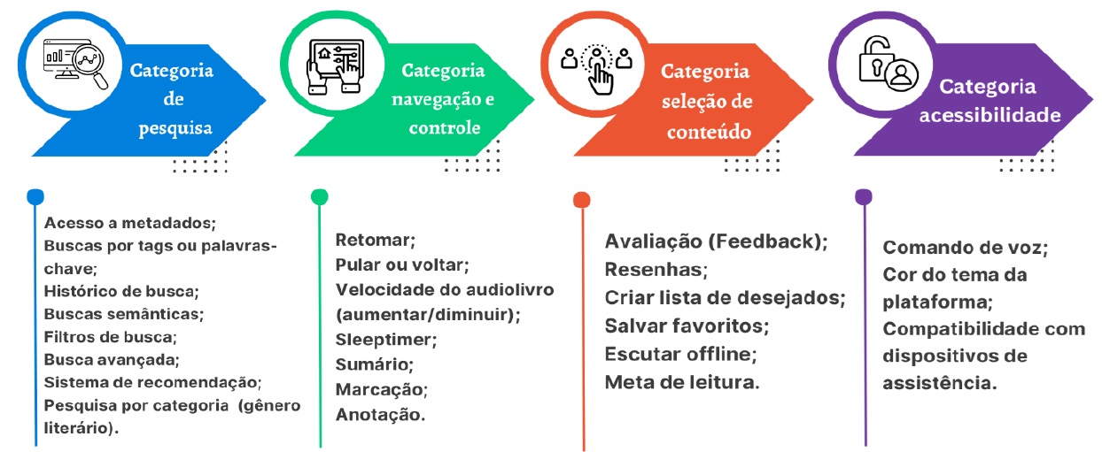 As funcionalidades observadas nas plataformas de audiolivros foram categorizadas em quatro grupos principais: pesquisa, navegação e controle, seleção de conteúdo e acessibilidade. A análise das funcionalidades à luz da recuperação de informação envolveu uma descrição detalhada de cada funcionalidade, incluindo seus conceitos relacionados e seu funcionamento prático. Foi possível observar que há muitas funcionalidades disponíveis e a importância de oferecer aos usuários recursos avançados como: sistemas de busca avançada, filtros personalizados, sistema de recomendação inteligente, acesso facilitado a metadados, opções de marcação e avaliação, entre outros. Essas funcionalidades não apenas facilitam a localização e o acesso a conteúdos específicos, mas também contribuem para uma recuperação mais eficiente.
